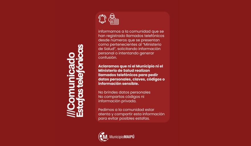 El Municipio de Maipú informó que en los últimos días se han registrado llamados telefónicos provenientes de números que se presentan falsamente como pertenecientes al Ministerio de Salud, con el objetivo de solicitar información personal o inducir a engaño.