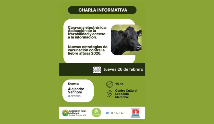 Jueves 26 a las 18 horas, en el Centro Cultural de Leopoldo Marechal, productores ganaderos de Maipú tendrán la oportunidad de participar de una charla informativa sobre los cambios en la gestión de hacienda, con foco en la implementación de la caravana electrónica y las estrategias de vacunación. La actividad está organizada por la Asociación Rural local, SENASA y el municipio, y busca acercar a quienes no pudieron asistir a reuniones anteriores.