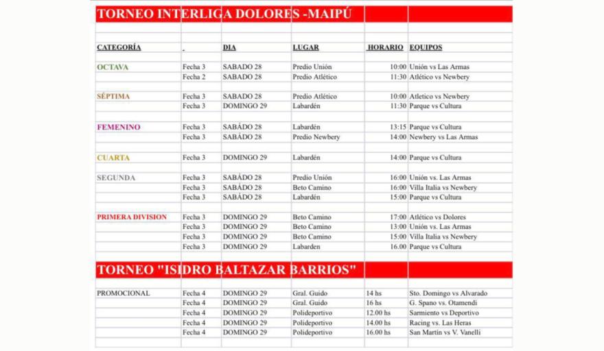 El Torneo Interliga Dolores-Maipú tendrá continuidad este fin de semana con la disputa de la Fecha 3 en la mayoría de las categorías, con encuentros programados entre sábado 28 y domingo 29 en distintas canchas de la región.