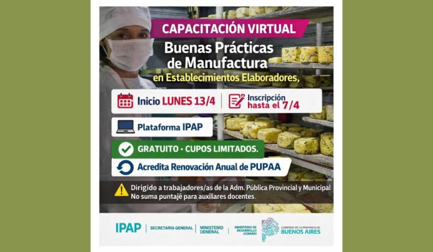 El Instituto Provincial de la Administración Pública (IPAP), junto a la Subsecretaría de Gestión y Empleo Público y el Ministerio de Desarrollo Agrario, abrió la inscripción a la capacitación virtual “Buenas Prácticas de Manufactura en Establecimientos Elaboradores”.